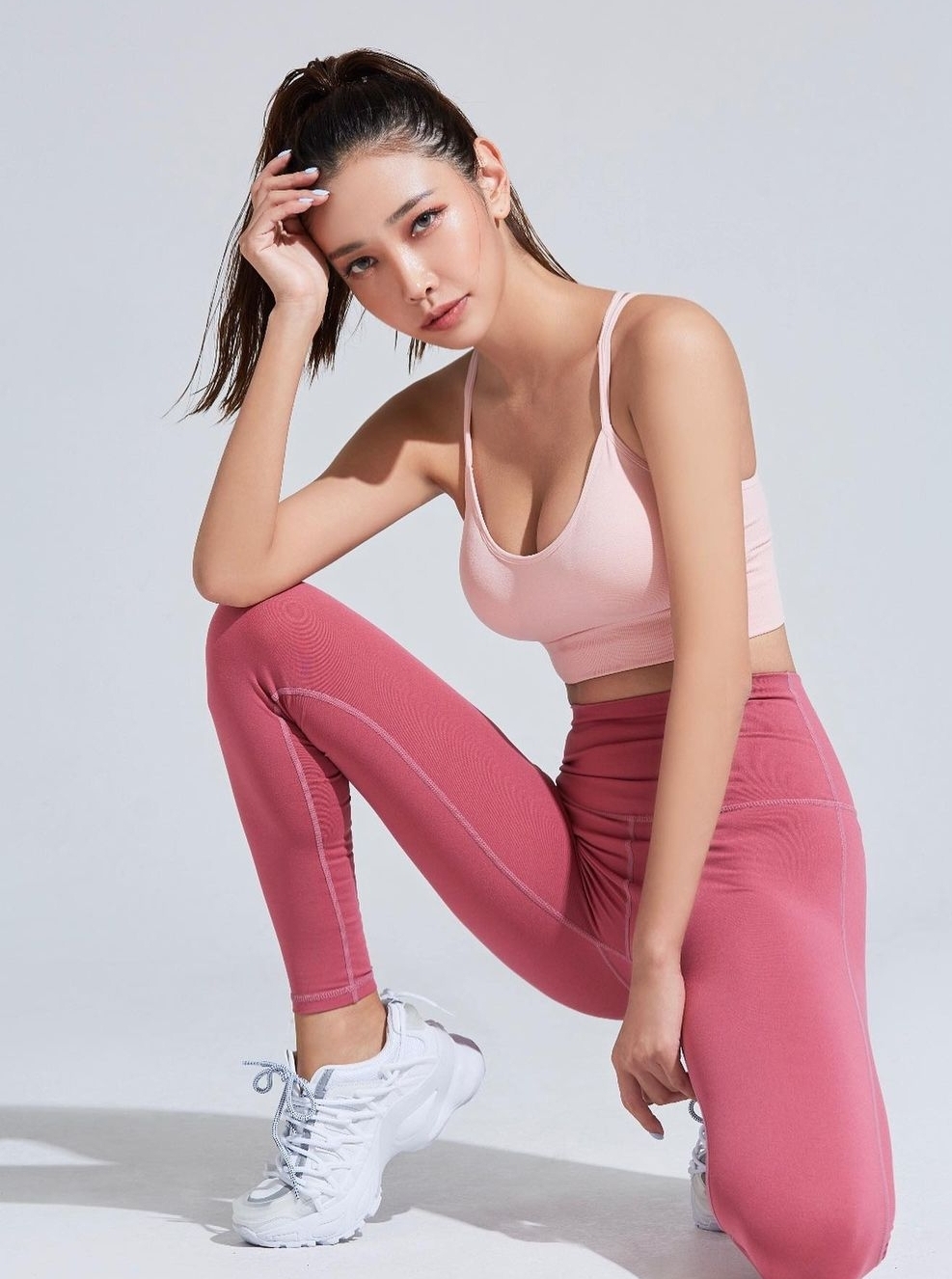 여자모델이 요가복 피팅촬영을 하고 있습니다.